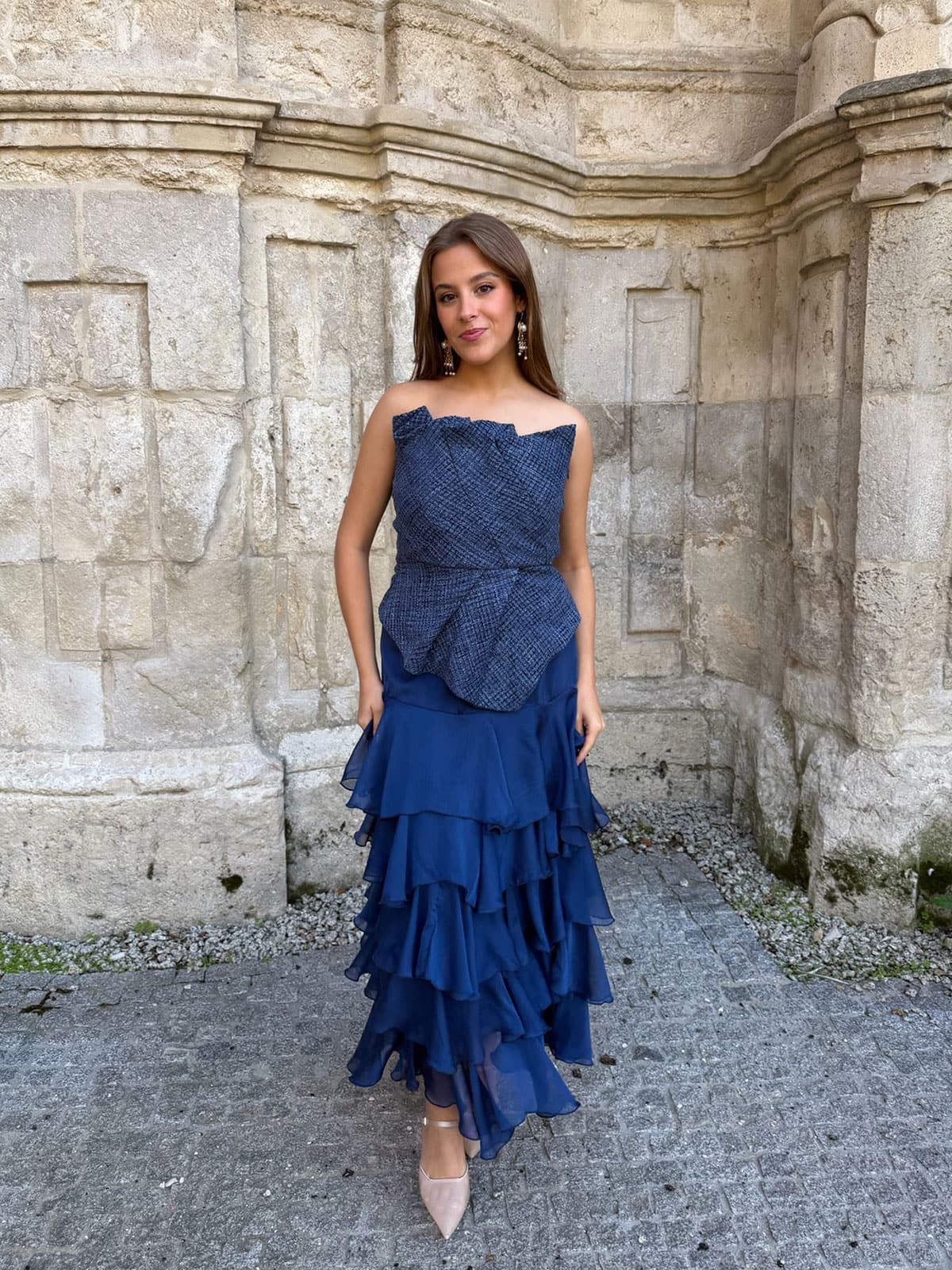 Top palabra de honor, tipo corsé ceñido a cintura con punto smock de la espalda. Cremallera lateral invisible. Bajo desigual con pliegues.