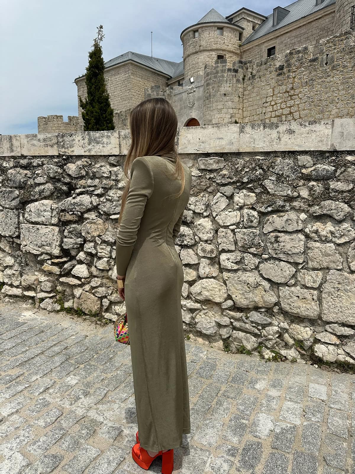 Vestido ajustado en punto seda color champange verdoso.