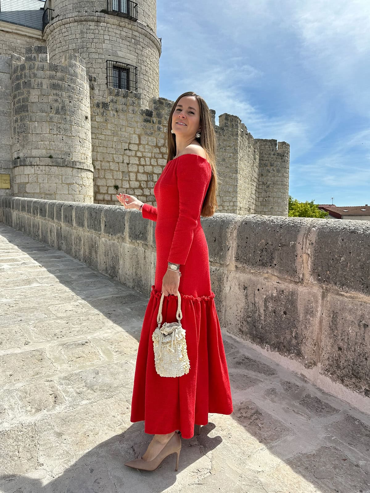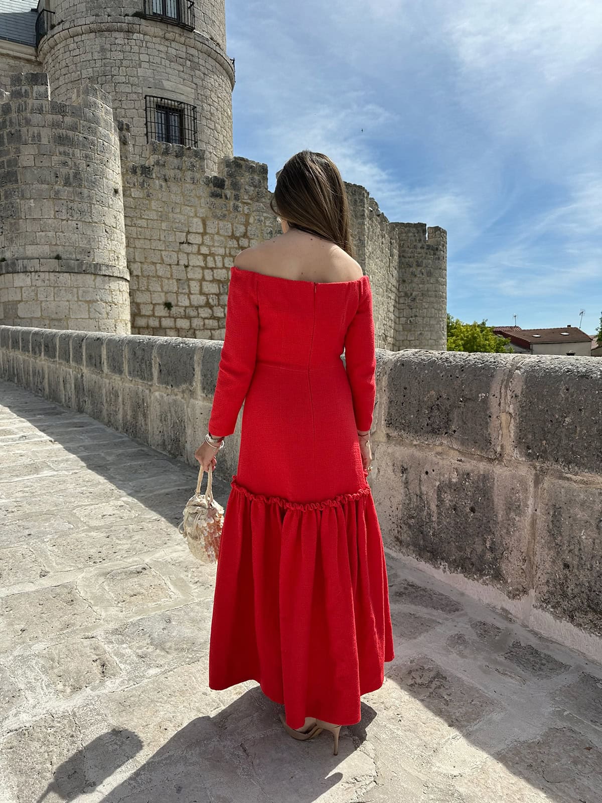 Vestido rojo escote bardot y manga larga.