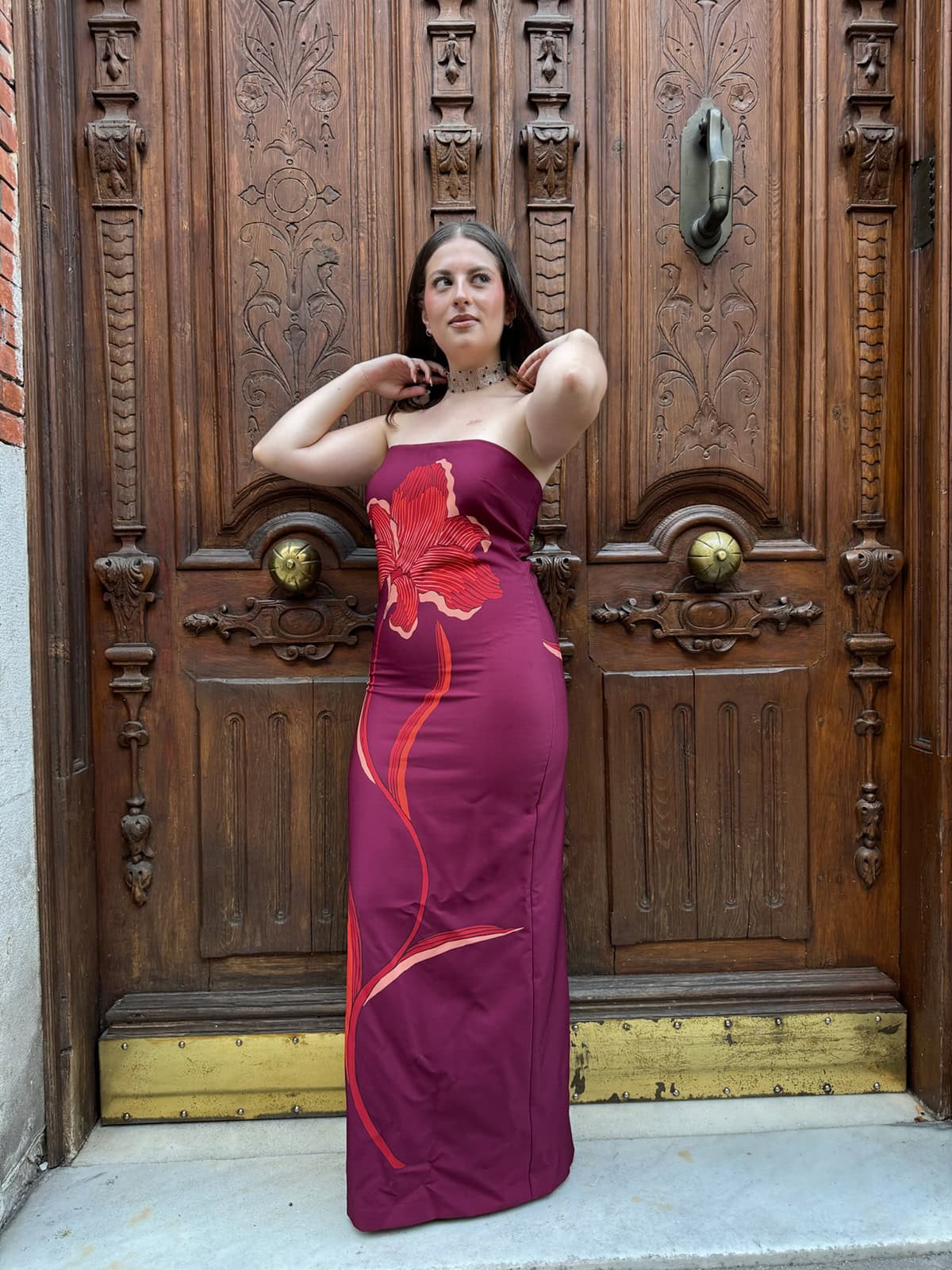El vestido está cortado para que llegue a ras de suelo en una persona de 170 cm sin tacones o con tacón mini.